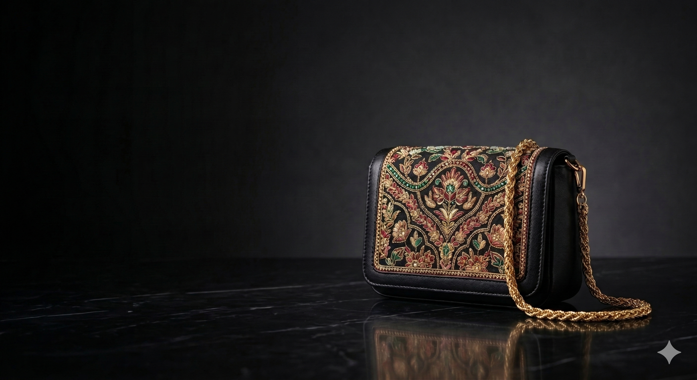 Silver Hand-Embroidered Bridal Box Clutch with Gold Handle